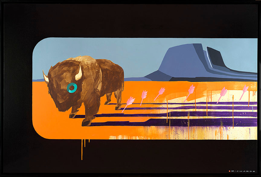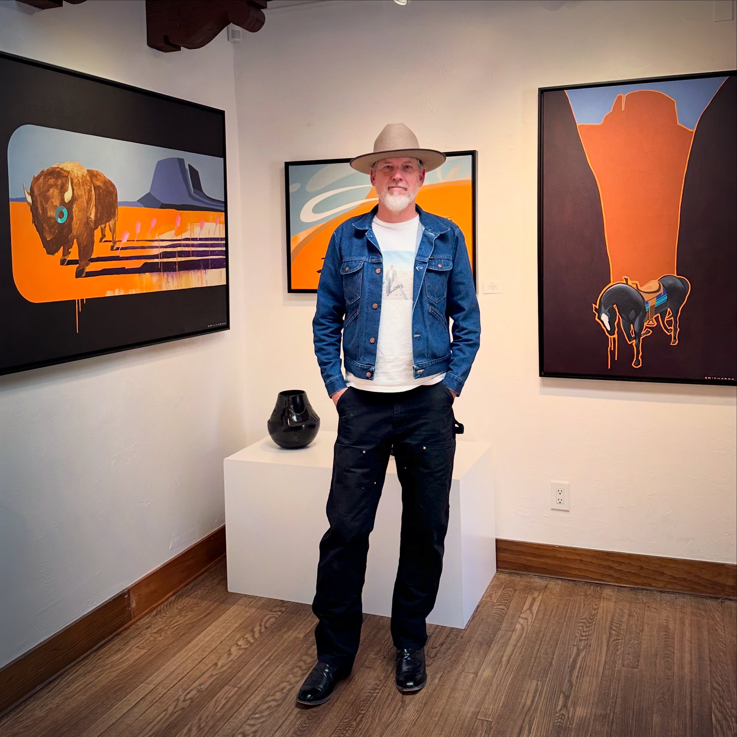 “Brad Richards transforms the rugged light and sweeping terrain of New Mexico’s high desert into a visual language rooted in his former life as an automotive and motorcycle industrial designer. Using that precision of form and attention to silhouette, his work distills the spirit of the American West — its freedom, its grit, its open horizons — into compositions that feel sleek and elemental. Through a palette that evokes desert dusk, chrome glint, and broad skies, Richards builds contemporary landscapes and animal-figures (buffalo, horses, high-desert icons) that merge the geometry of design with the raw romance of the frontier. The result: art that is at once minimalist and emotionally potent, grounded in place but elevated as modern expression.”